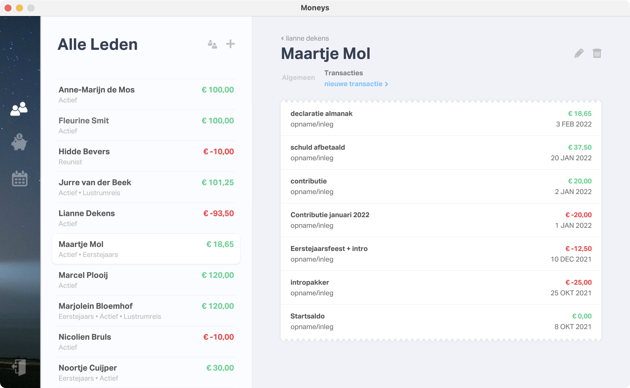 Exporteer op elk gewenst moment een overzicht met de schuldenstanden van je leden vanuit Moneys naar o.a. een excel-bestand.